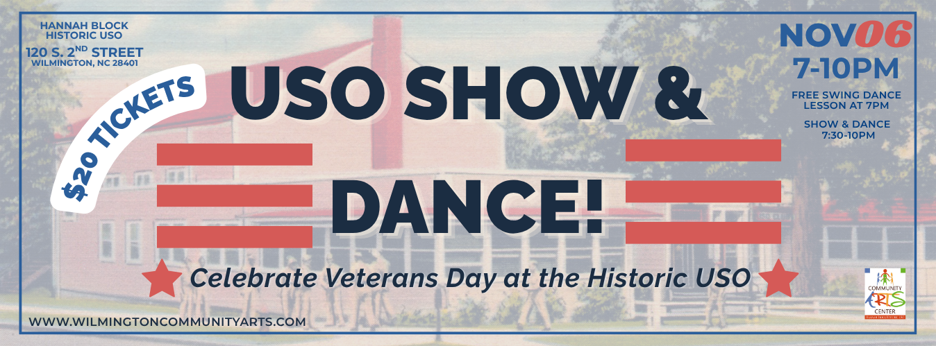 The Hannah Block Historic USO/Community Arts Center will be THE place to celebrate Veterans Day 2026 with a 1940s style USO Show & Dance to honor Southeast North Carolina veterans. The one night only event will be Friday, November 6, 2026.