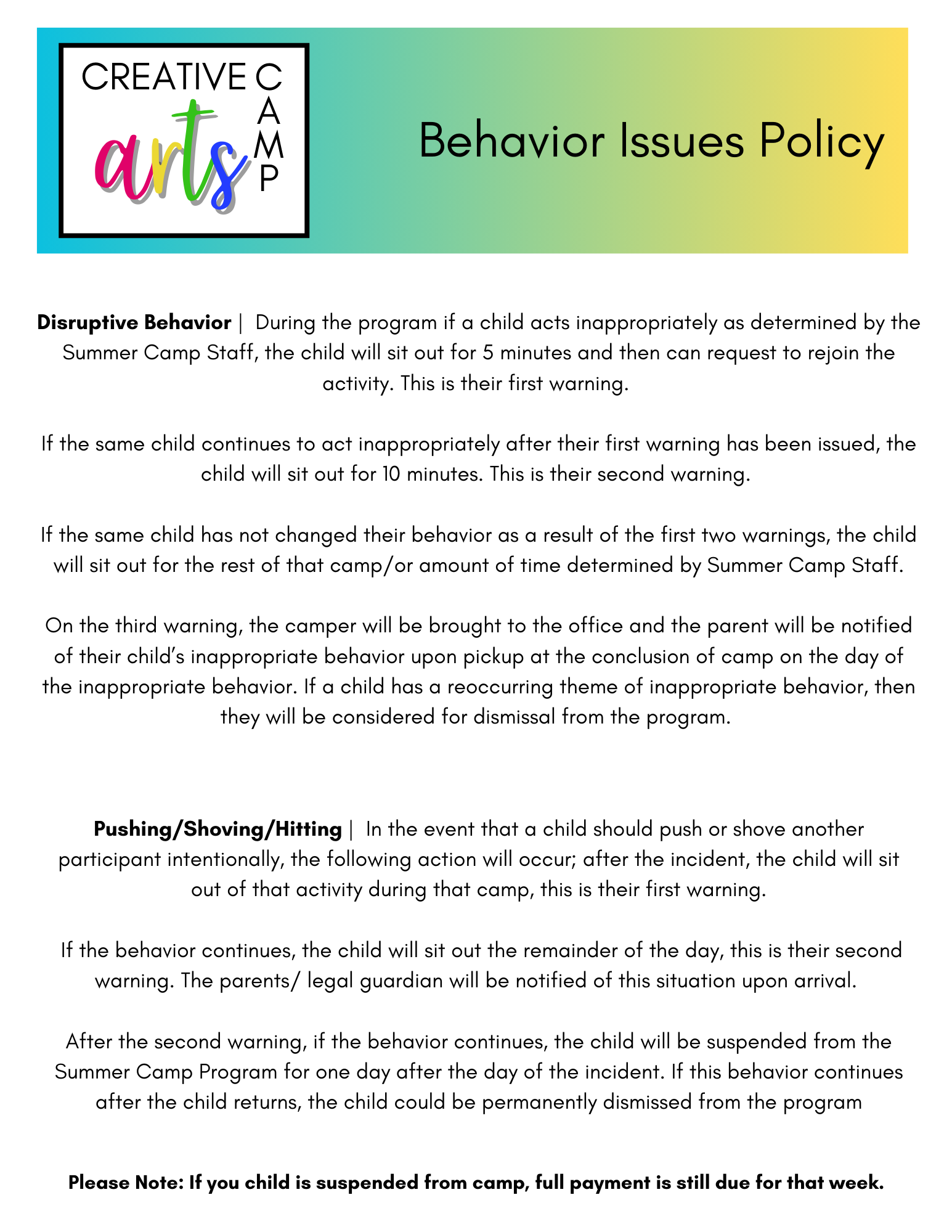 If you decide to cancel, you must do so 7 days prior to the first day of the week your child was registered to receive a tuition refund. There will be an automatic $10 cancellation fee PER CHILD. If 7 days notice is not given prior to cancellation, there will be a 50% refund. Any cancelation requests received after your camp session has started will not receive a refund. Cancellations must be received via e-mail at [email protected].